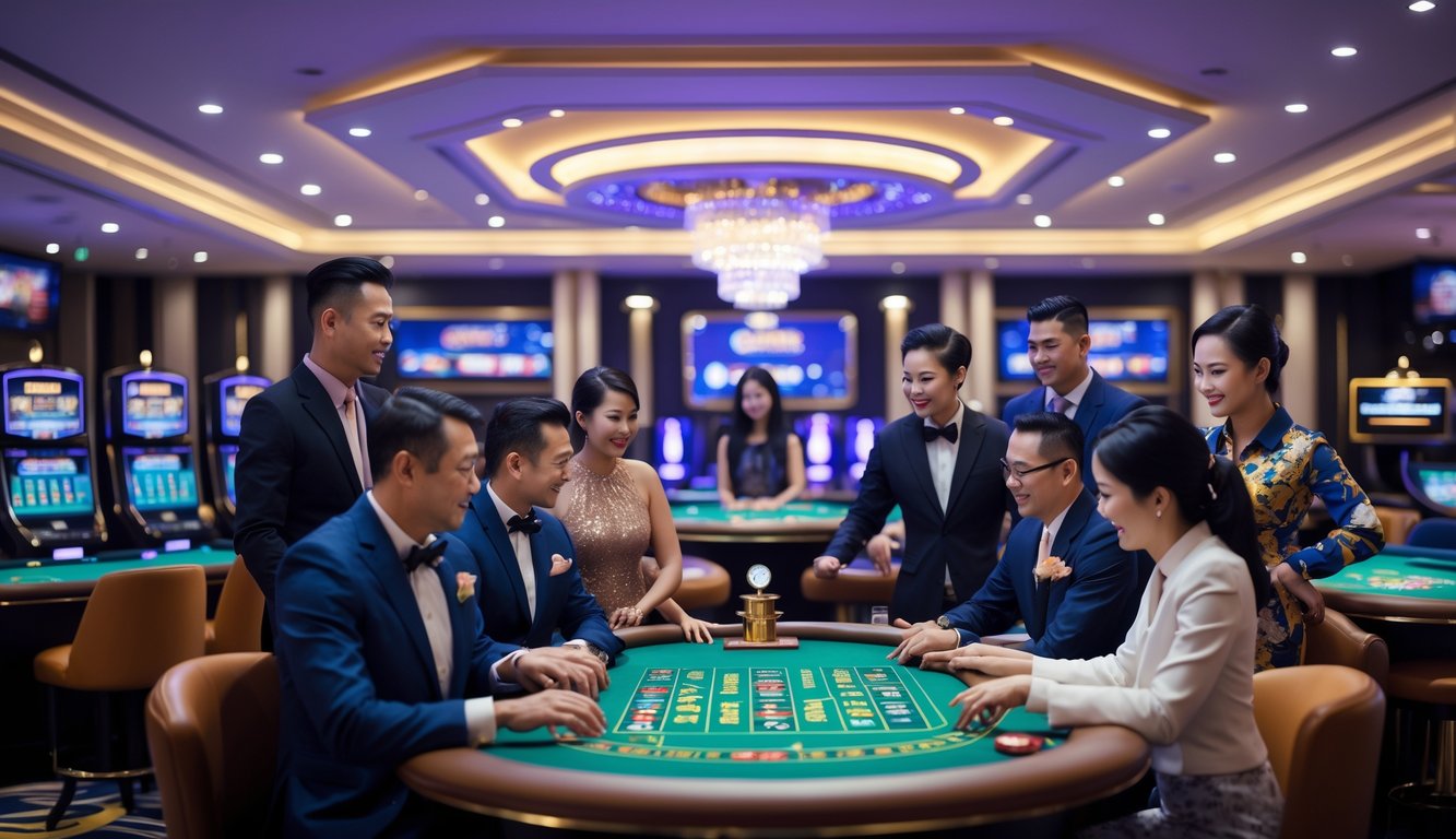 Sejumlah orang bermain permainan kasino langsung di ruangan kasino yang mewah dan terang, dengan dealer yang ramah dan suasana yang menyenangkan.